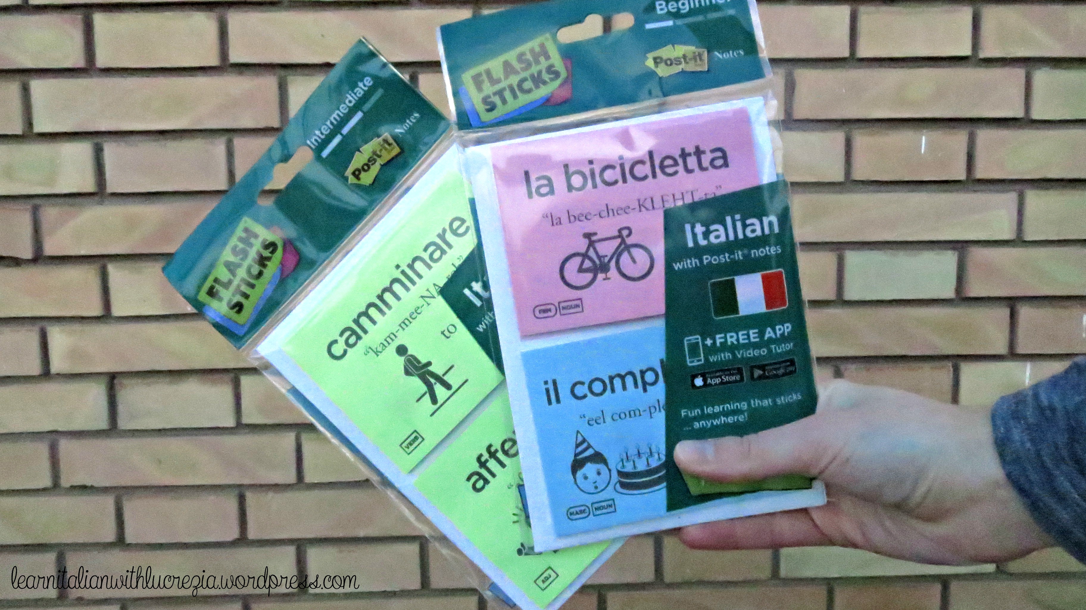 The second tip is using sticky notes with words on them that you can stick on objects you want to learn the names of. You can write the words yourself or use pre-printed sticky notes. Have you ever heard of Flashsticks? They are Post-It notes with foreign words written on them. They come in eight different languages (one of them is Italian!) and for each language you can choose from three levels of proficiency: beginner, intermediate and advanced.